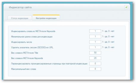 Модуль позволяет индексировать сайт, задавая в настройках различные параметры. Возможно также указать: